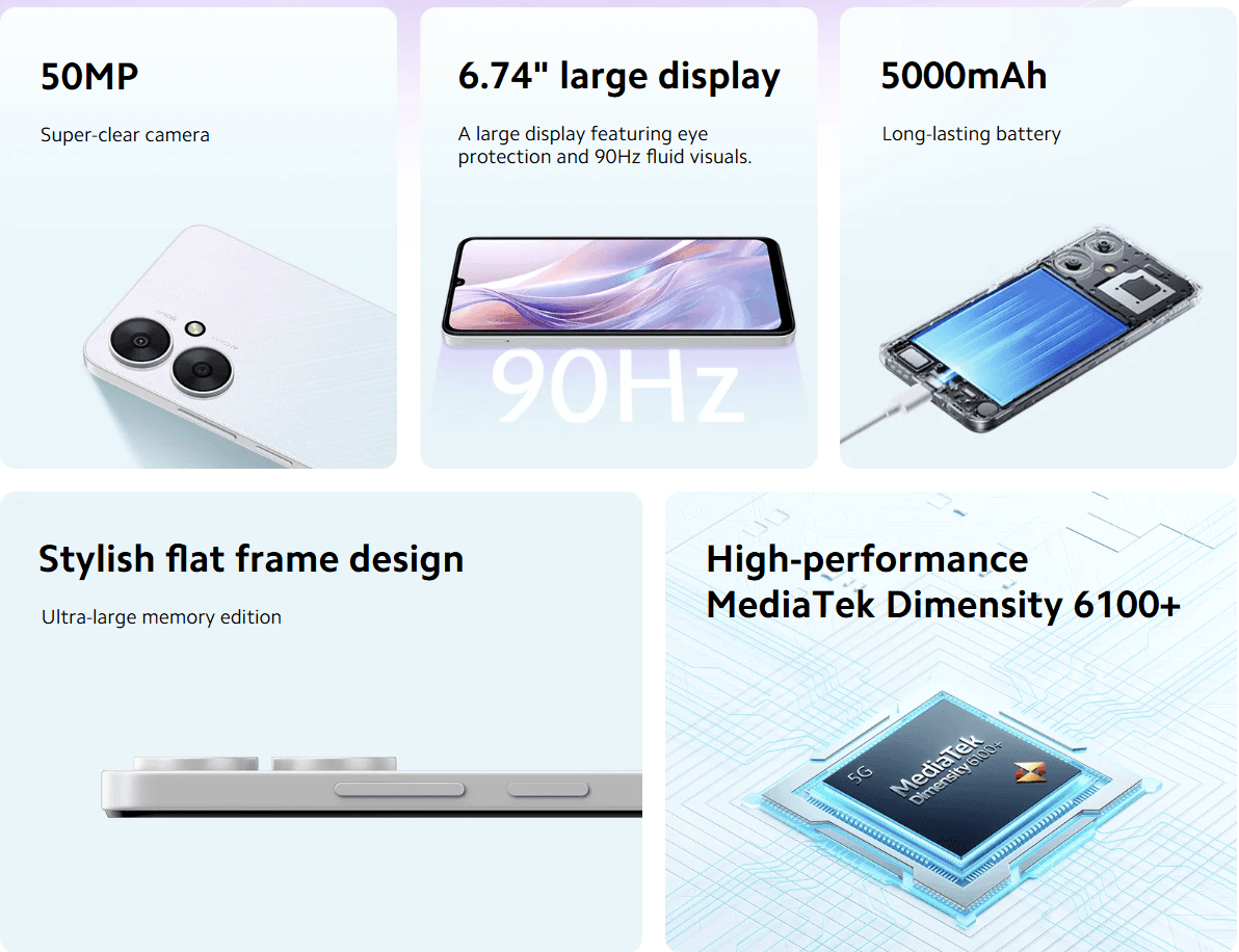El Xiaomi Redmi 13C 5G es la variante con conectividad 5G del Redmi 13C y tiene una pantalla LCD de 6.74 pulgadas a resolución HD+ y tasa de refresco de 90Hz. Por dentro, encontramos un procesador Dimensity 6100 Plus de MediaTek junto con hasta 8GB de RAM y 256GB de almacenamiento interno. Su cámara posterior dual cuenta con un sensor principal de 50MP y se alimenta de una batería de 5000 mAh de carga rápida. El Redmi 13C 5G suma lector de huellas lateral, MIUI 14, y resistencia a salpicaduras